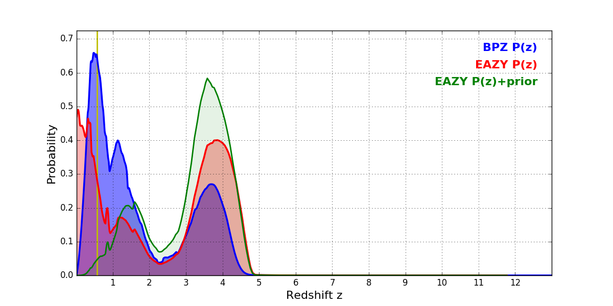 In P(z) plots: Yellow lines mark the cluster redshift z = 0.566,