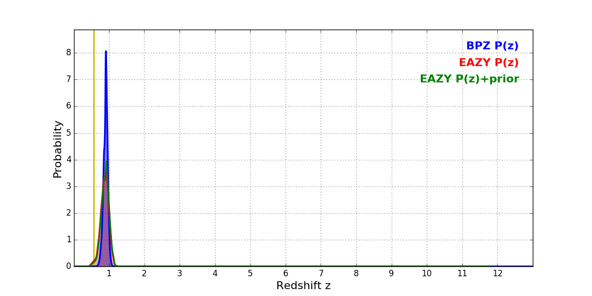 In P(z) plots: Yellow lines mark the cluster redshift z = 0.566,