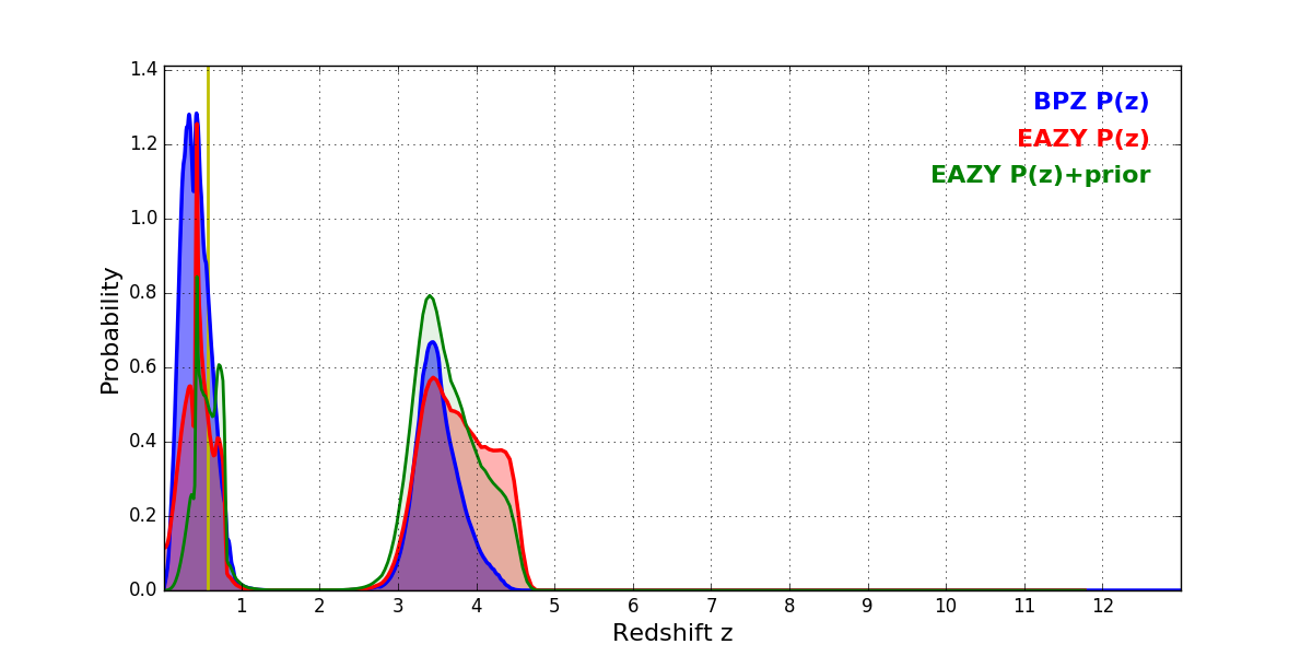 In P(z) plots: Yellow lines mark the cluster redshift z = 0.566,