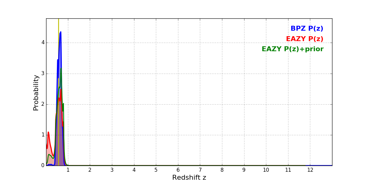 In P(z) plots: Yellow lines mark the cluster redshift z = 0.566,