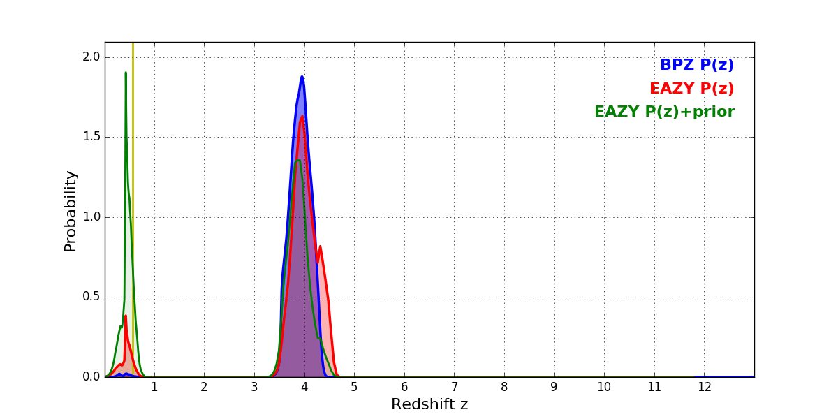 In P(z) plots: Yellow lines mark the cluster redshift z = 0.566,