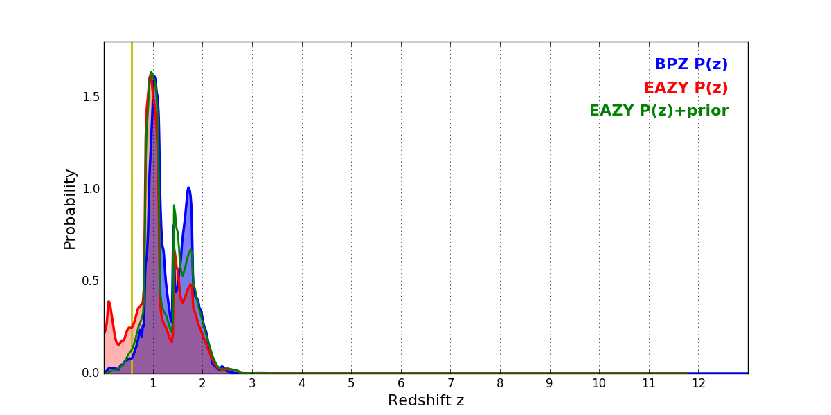 In P(z) plots: Yellow lines mark the cluster redshift z = 0.566,