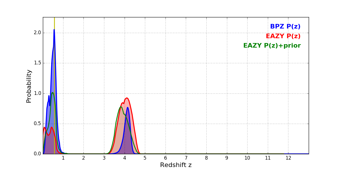 In P(z) plots: Yellow lines mark the cluster redshift z = 0.566,