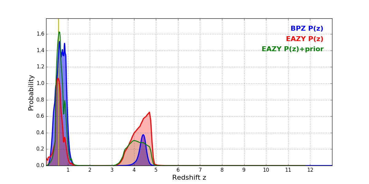 In P(z) plots: Yellow lines mark the cluster redshift z = 0.566,