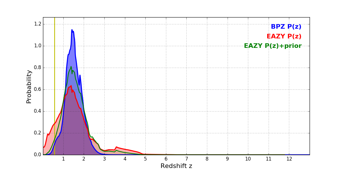 In P(z) plots: Yellow lines mark the cluster redshift z = 0.566,