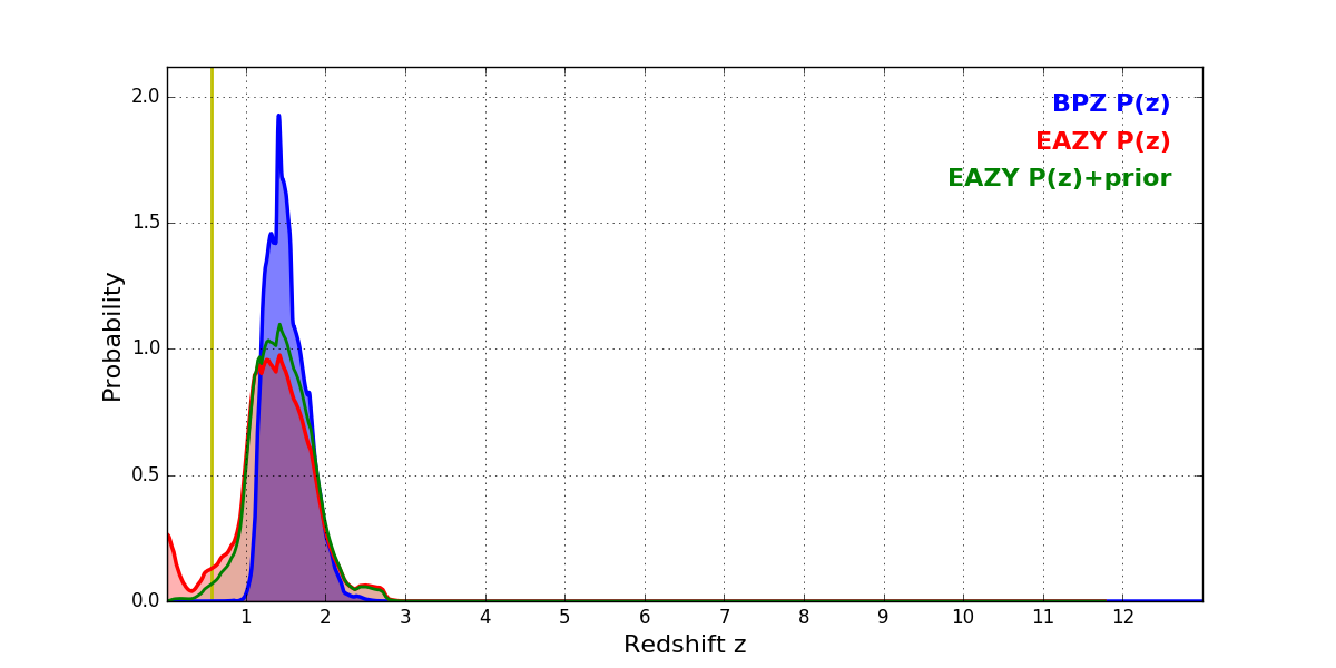 In P(z) plots: Yellow lines mark the cluster redshift z = 0.566,