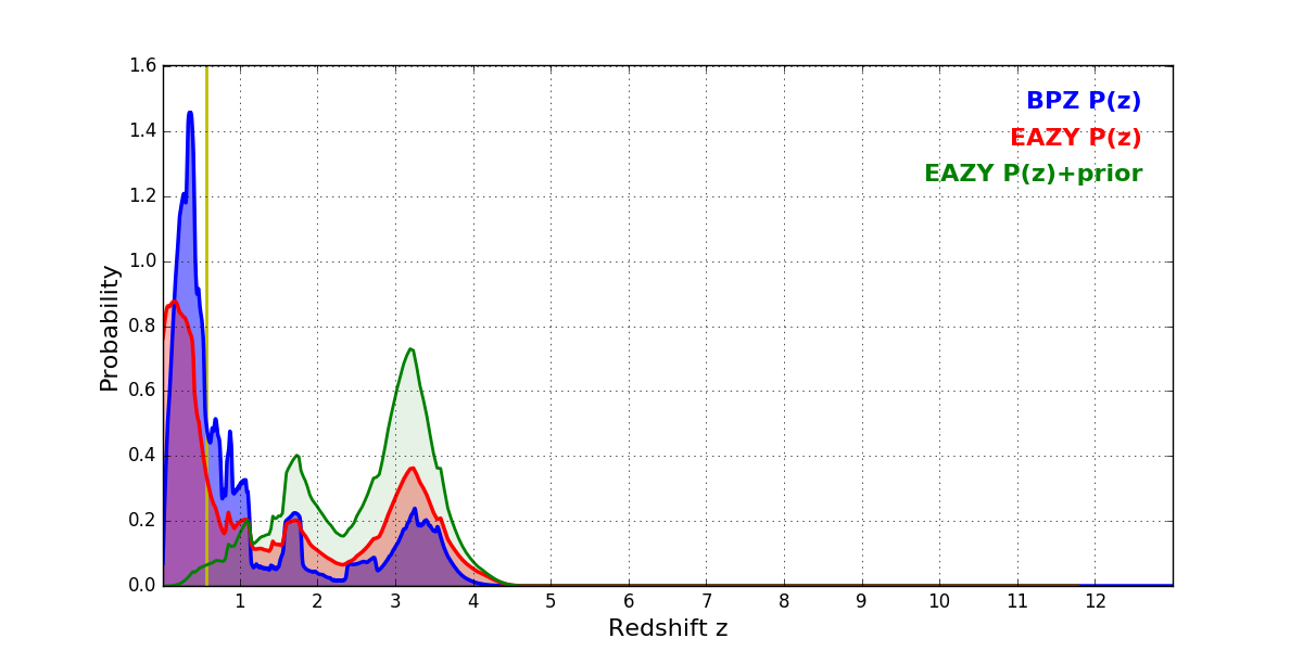 In P(z) plots: Yellow lines mark the cluster redshift z = 0.566,