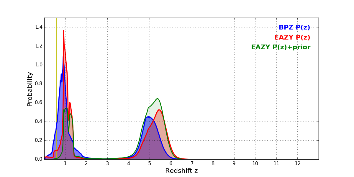 In P(z) plots: Yellow lines mark the cluster redshift z = 0.566,