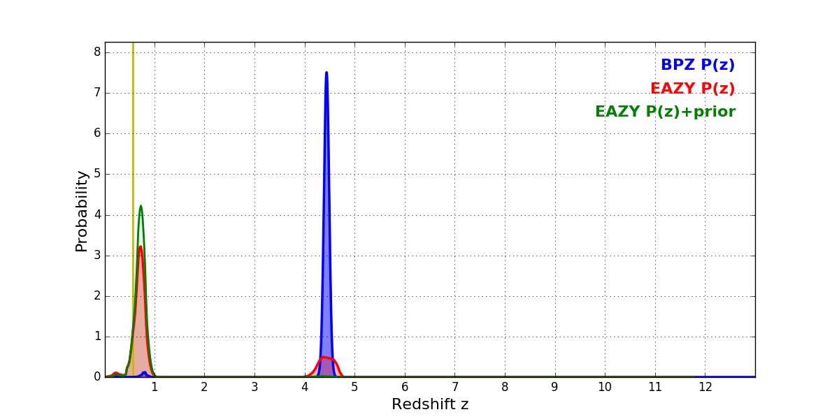In P(z) plots: Yellow lines mark the cluster redshift z = 0.566,