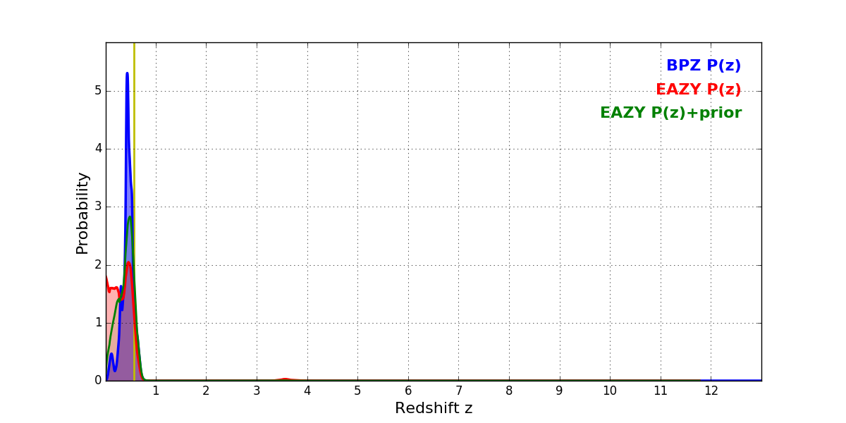 In P(z) plots: Yellow lines mark the cluster redshift z = 0.566,