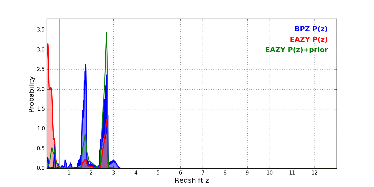 In P(z) plots: Yellow lines mark the cluster redshift z = 0.566,