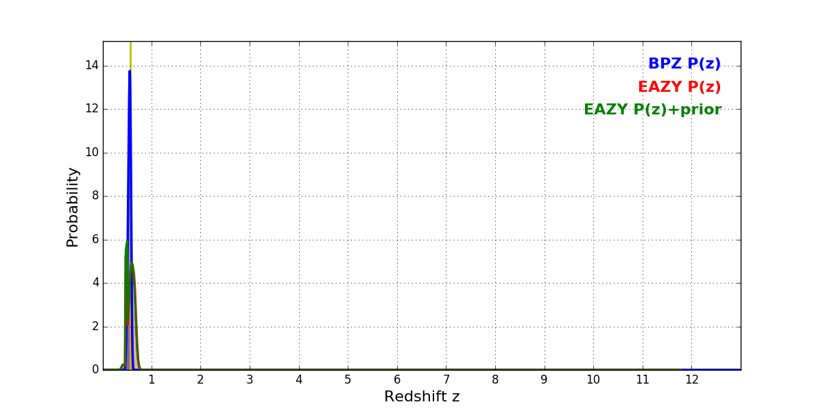 In P(z) plots: Yellow lines mark the cluster redshift z = 0.566,