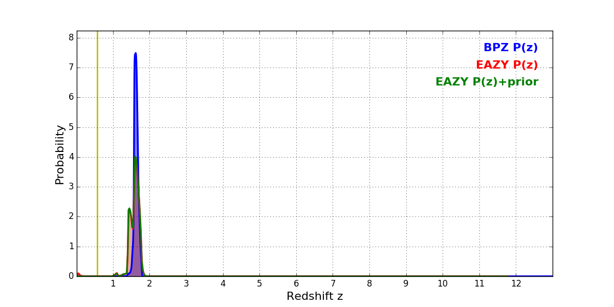 In P(z) plots: Yellow lines mark the cluster redshift z = 0.566,