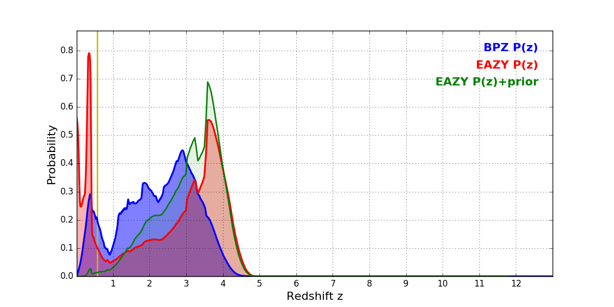 In P(z) plots: Yellow lines mark the cluster redshift z = 0.566,