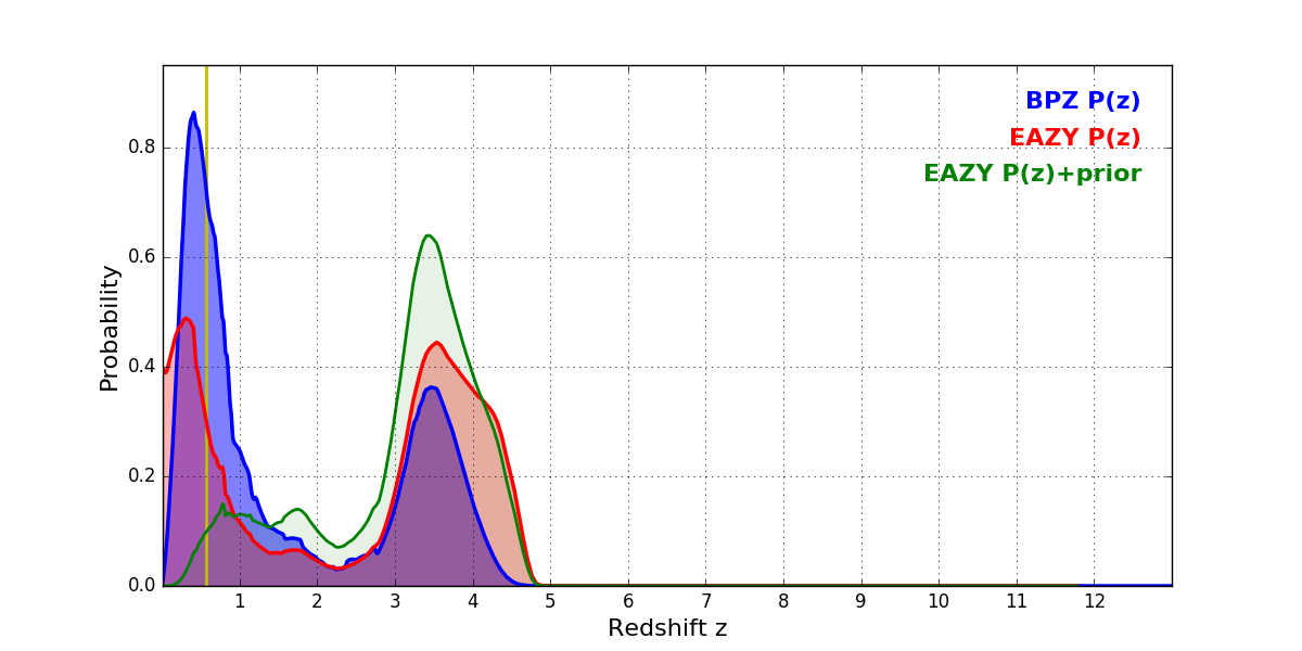 In P(z) plots: Yellow lines mark the cluster redshift z = 0.566,