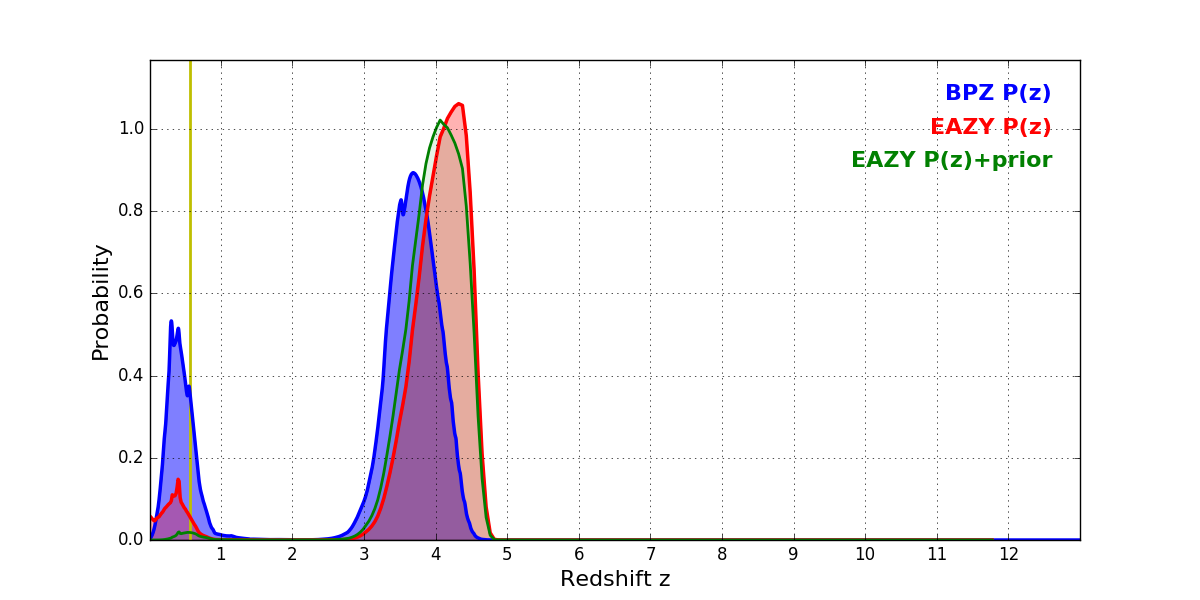 In P(z) plots: Yellow lines mark the cluster redshift z = 0.566,