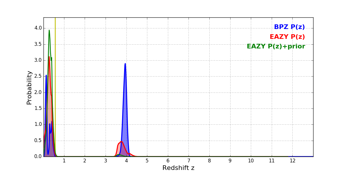 In P(z) plots: Yellow lines mark the cluster redshift z = 0.566,