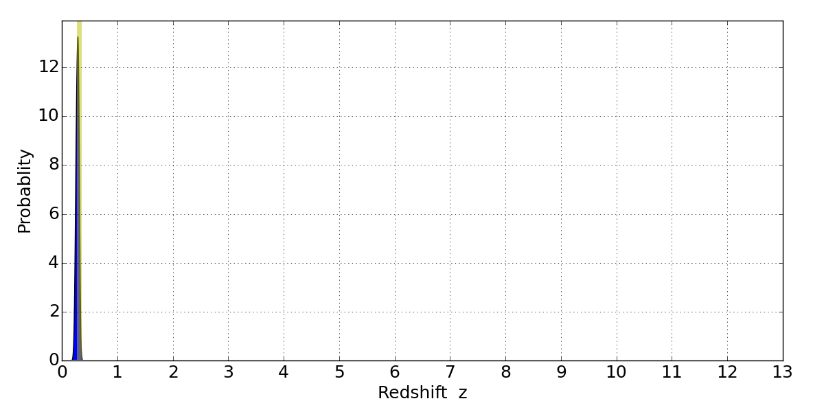 In P(z) plots: Yellow lines mark the cluster redshift z = 0.307,