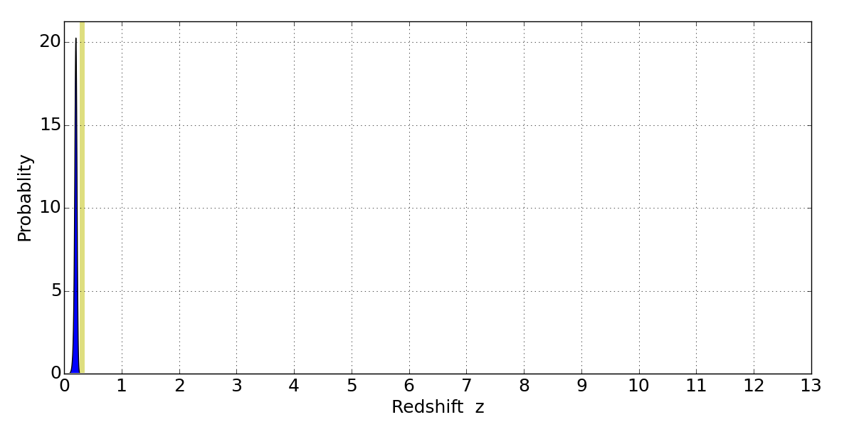 In P(z) plots: Yellow lines mark the cluster redshift z = 0.307,