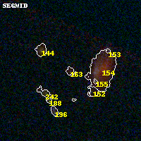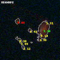 Object #163 x,y = (3576, 3087) RA, Dec = (11:31:49.800, -19:54:47.52) = (172.95750, -19.91320) BPZ = 1.414 [0.195--3.243] type = 8.30 (SB1_B10 - SB2_B10) chisq2 = 0.13 ODDS = 0.14 z_cluster = 0.307