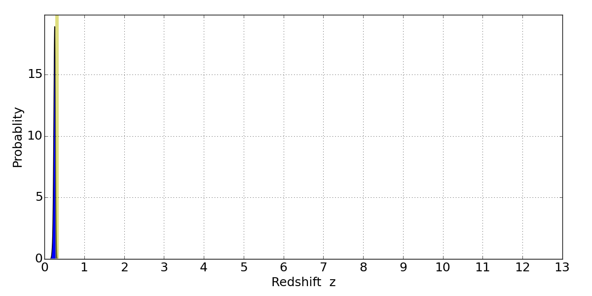 In P(z) plots: Yellow lines mark the cluster redshift z = 0.307,