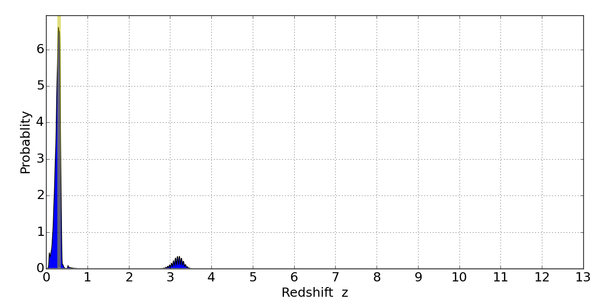 In P(z) plots: Yellow lines mark the cluster redshift z = 0.307,