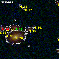 Object #42 x,y = (2161, 3441) RA, Dec = (11:31:55.800, -19:54:26.28) = (172.98250, -19.90730) BPZ = 1.215 [1.129--1.359] type = 8.70 (SB2_B10 - SB1_B10) chisq2 = 0.05 ODDS = 0.89 z_cluster = 0.307