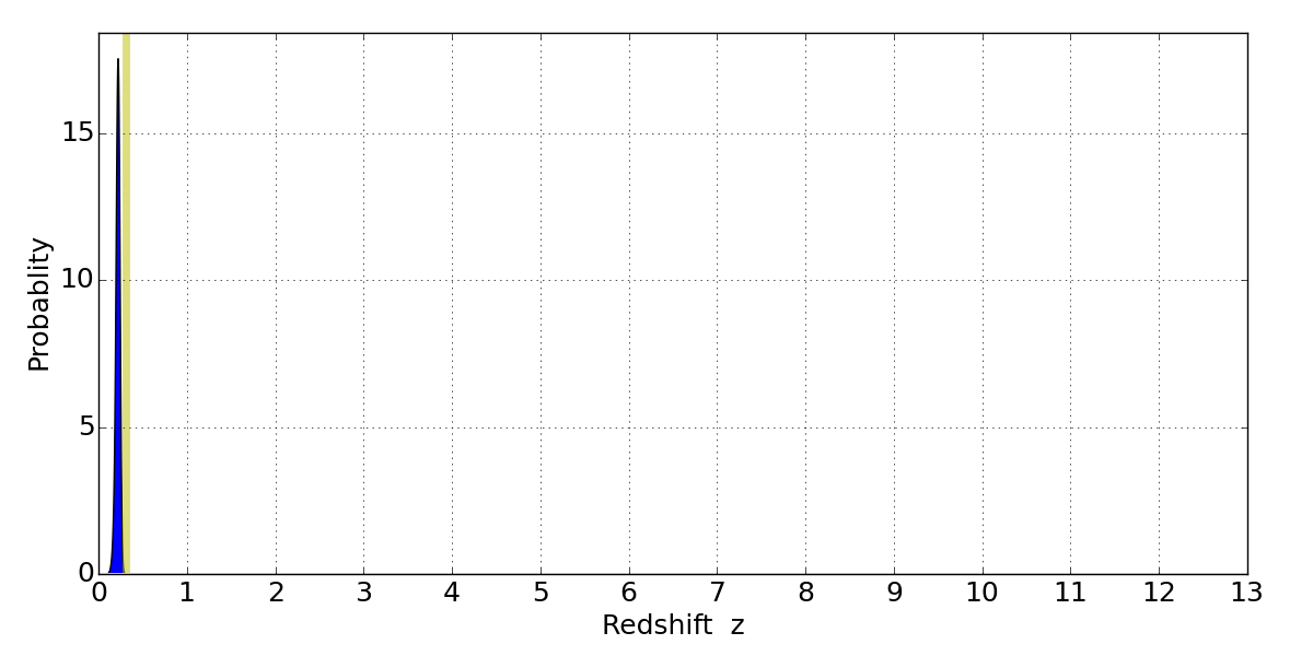 In P(z) plots: Yellow lines mark the cluster redshift z = 0.307,