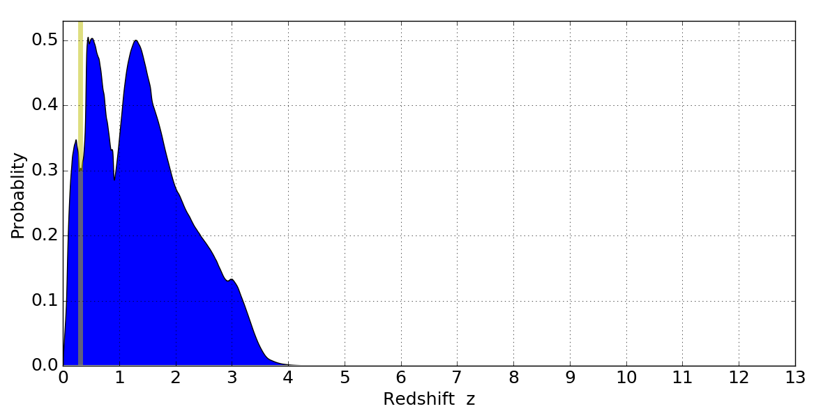 In P(z) plots: Yellow lines mark the cluster redshift z = 0.307,