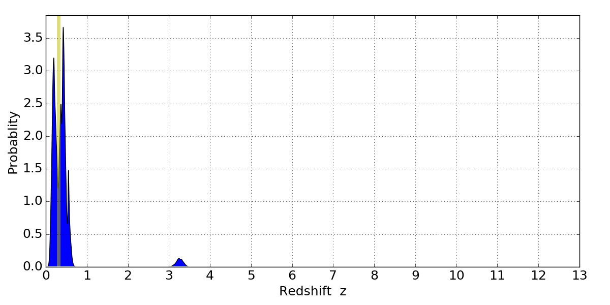 In P(z) plots: Yellow lines mark the cluster redshift z = 0.307,