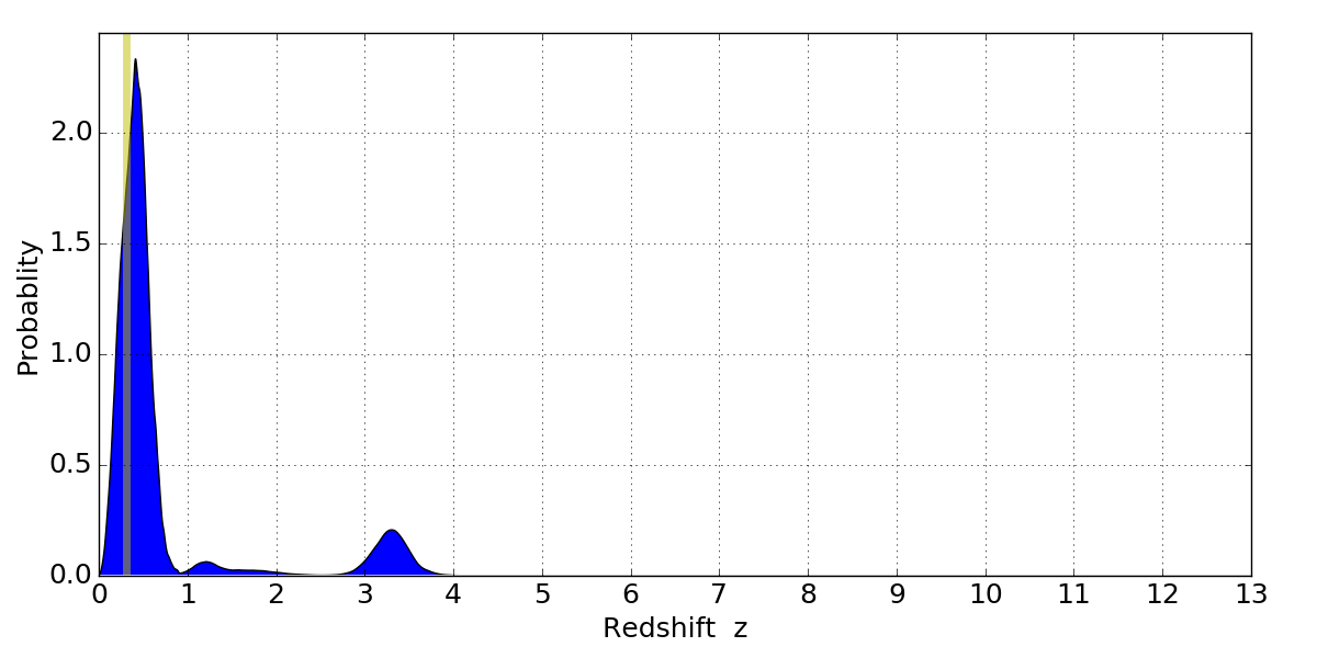 In P(z) plots: Yellow lines mark the cluster redshift z = 0.307,