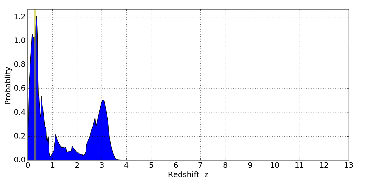 In P(z) plots: Yellow lines mark the cluster redshift z = 0.307,