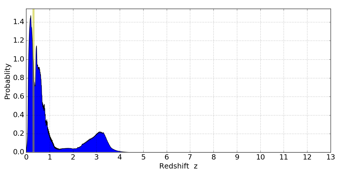 In P(z) plots: Yellow lines mark the cluster redshift z = 0.307,
