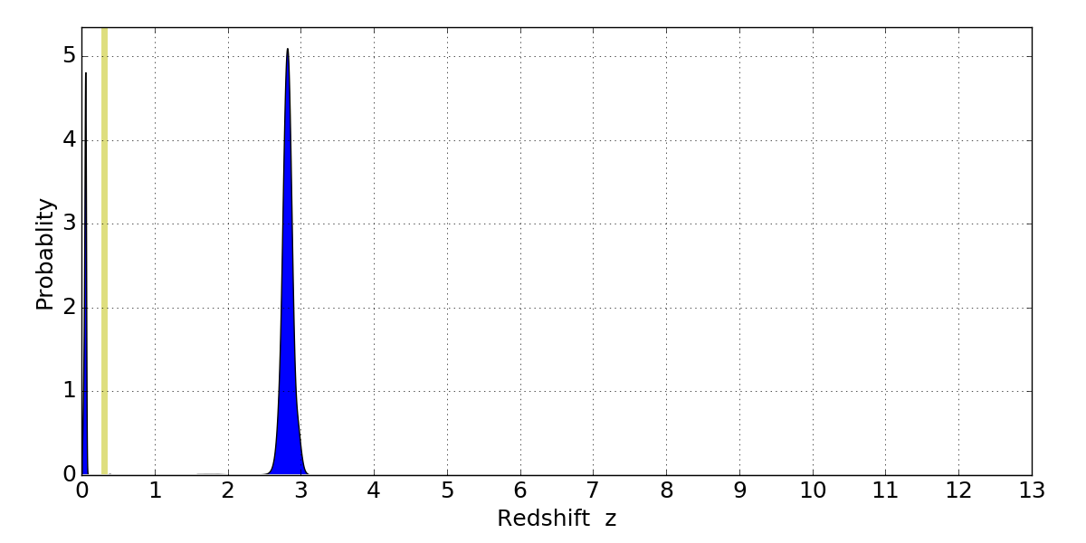 In P(z) plots: Yellow lines mark the cluster redshift z = 0.307,