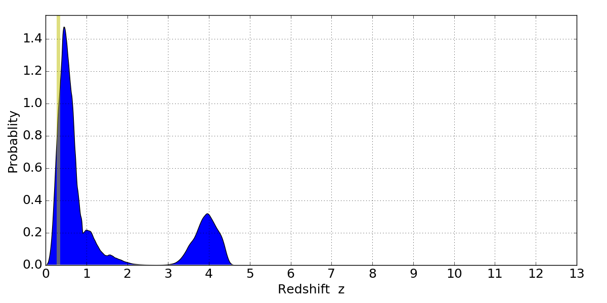 In P(z) plots: Yellow lines mark the cluster redshift z = 0.307,
