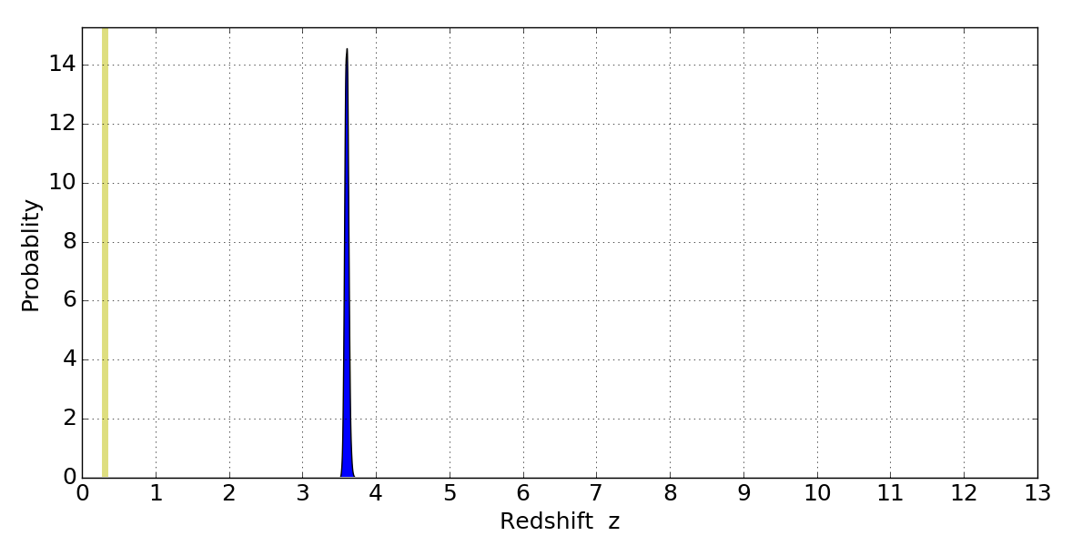 In P(z) plots: Yellow lines mark the cluster redshift z = 0.307,