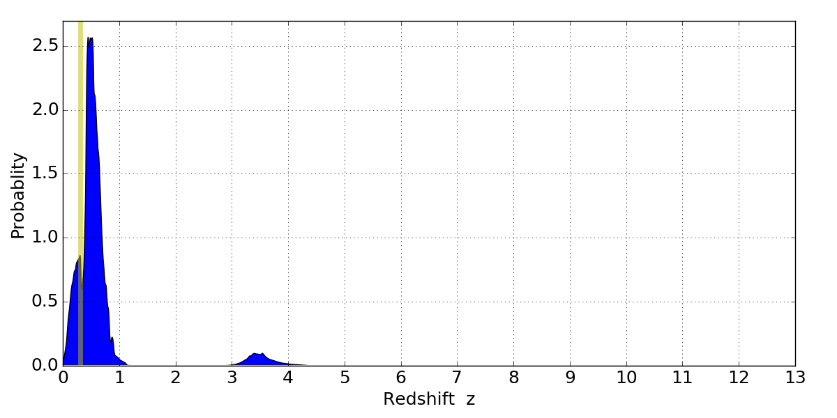 In P(z) plots: Yellow lines mark the cluster redshift z = 0.307,