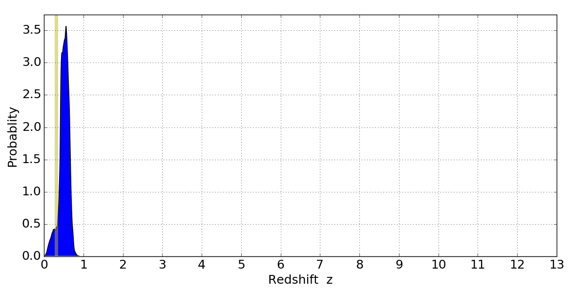 In P(z) plots: Yellow lines mark the cluster redshift z = 0.307,