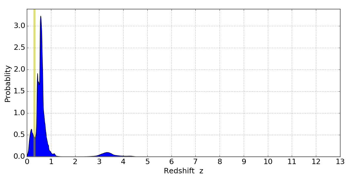 In P(z) plots: Yellow lines mark the cluster redshift z = 0.307,