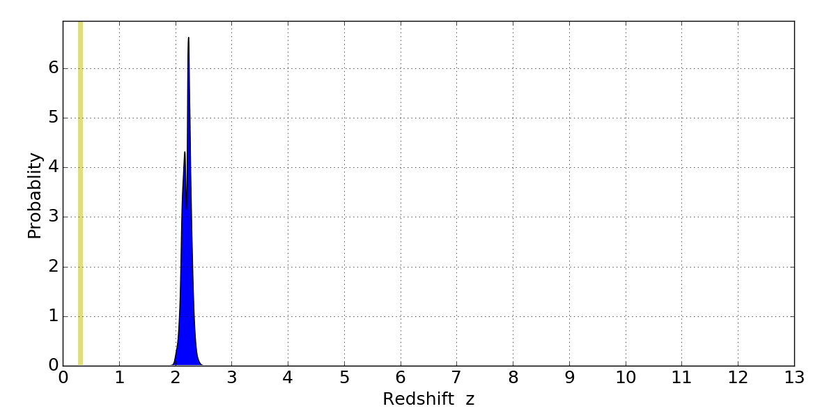 In P(z) plots: Yellow lines mark the cluster redshift z = 0.307,