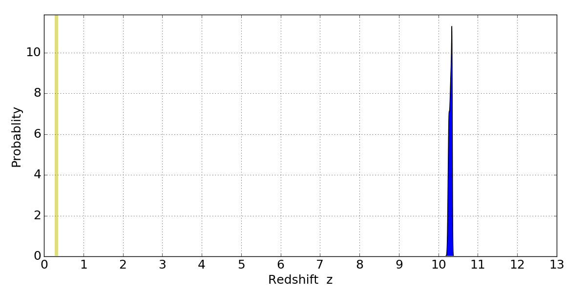 In P(z) plots: Yellow lines mark the cluster redshift z = 0.307,