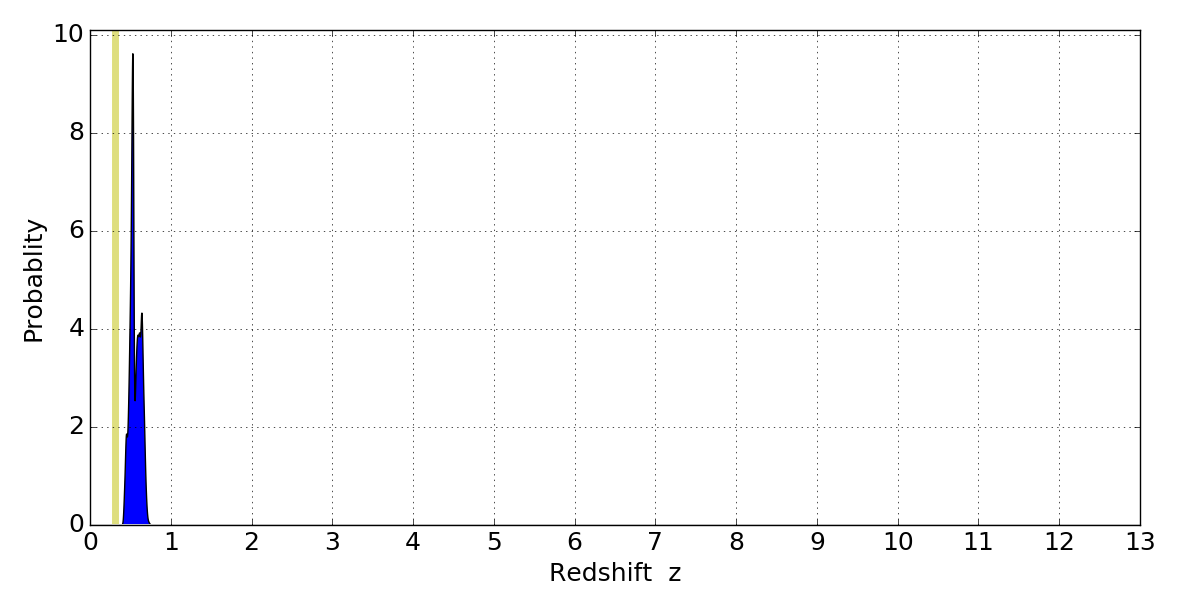 In P(z) plots: Yellow lines mark the cluster redshift z = 0.307,