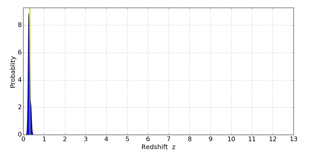 In P(z) plots: Yellow lines mark the cluster redshift z = 0.307,
