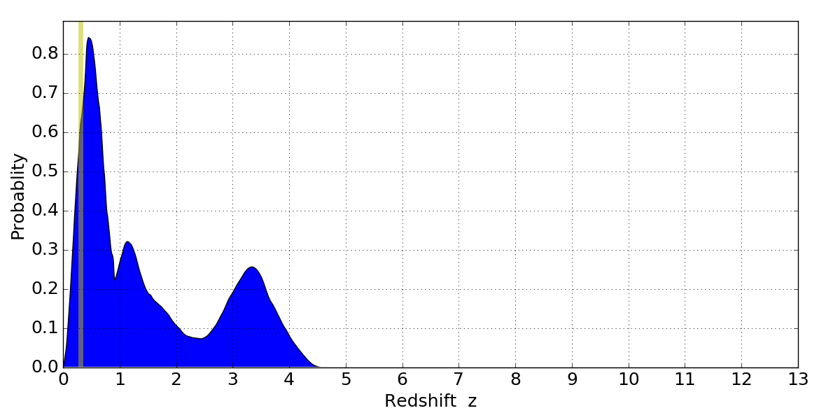 In P(z) plots: Yellow lines mark the cluster redshift z = 0.307,