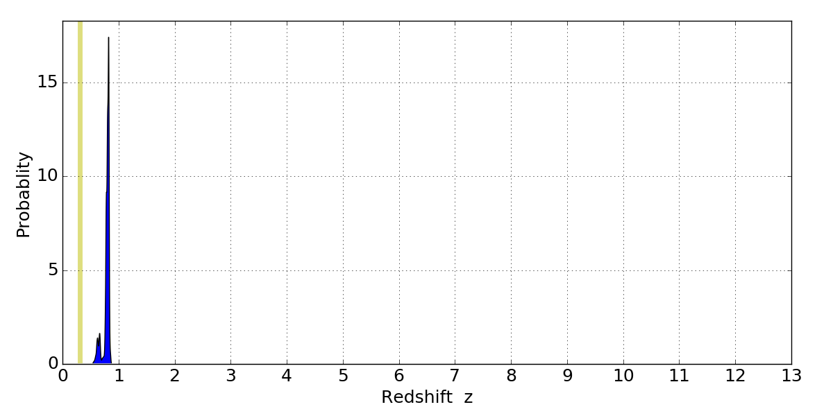 In P(z) plots: Yellow lines mark the cluster redshift z = 0.307,