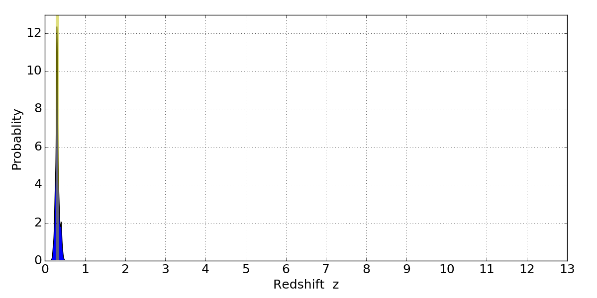 In P(z) plots: Yellow lines mark the cluster redshift z = 0.307,