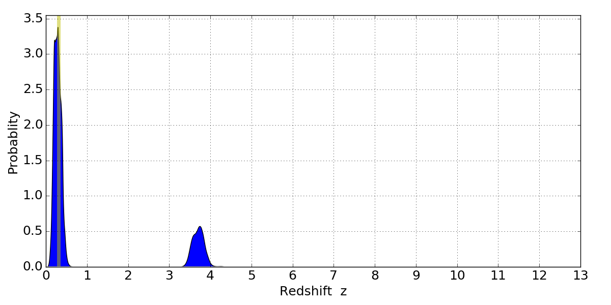In P(z) plots: Yellow lines mark the cluster redshift z = 0.307,