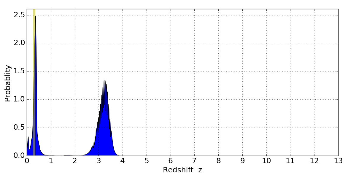 In P(z) plots: Yellow lines mark the cluster redshift z = 0.307,