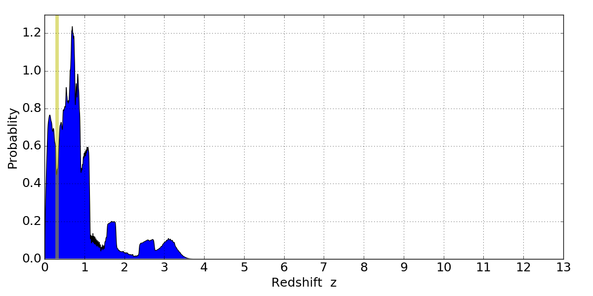In P(z) plots: Yellow lines mark the cluster redshift z = 0.307,