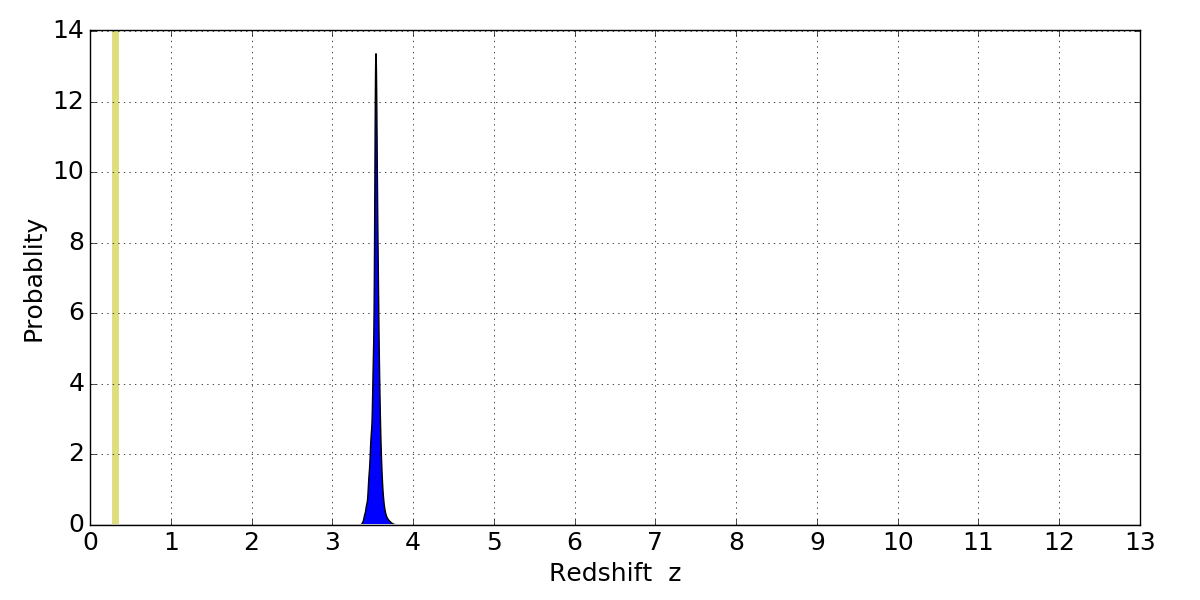 In P(z) plots: Yellow lines mark the cluster redshift z = 0.307,